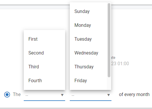 Week and Day | This Radio Button Allows you to set the End of Month Process to trigger on a certain Week and Day each month. For Example: we want the End of Month Process to Trigger on the First Monday each Month |