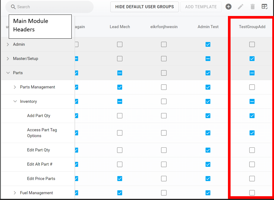 Placing a checkmark in the main module header line item gives the user group access to all subsections of that module