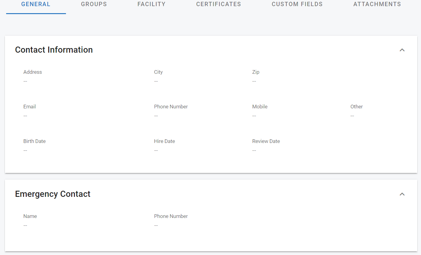 The General Tab houses all the contact information for the user/employee. Two panels exist. One for employee personal contact information and the other for an emergency contact.