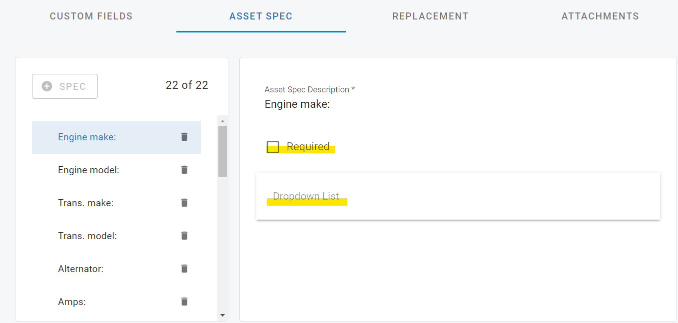 Once the custom fields tab has been defined, users can further control the data that is input into those description fields by utilizing the Asset Spec Tab.