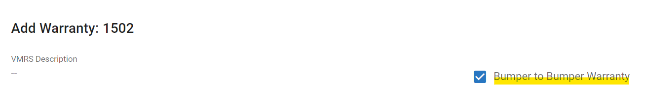 You may need to create a new VMRS code for bumper to bumper warranties. Refer to VMRS Codes for information and instruction on VMRS code maintenance
