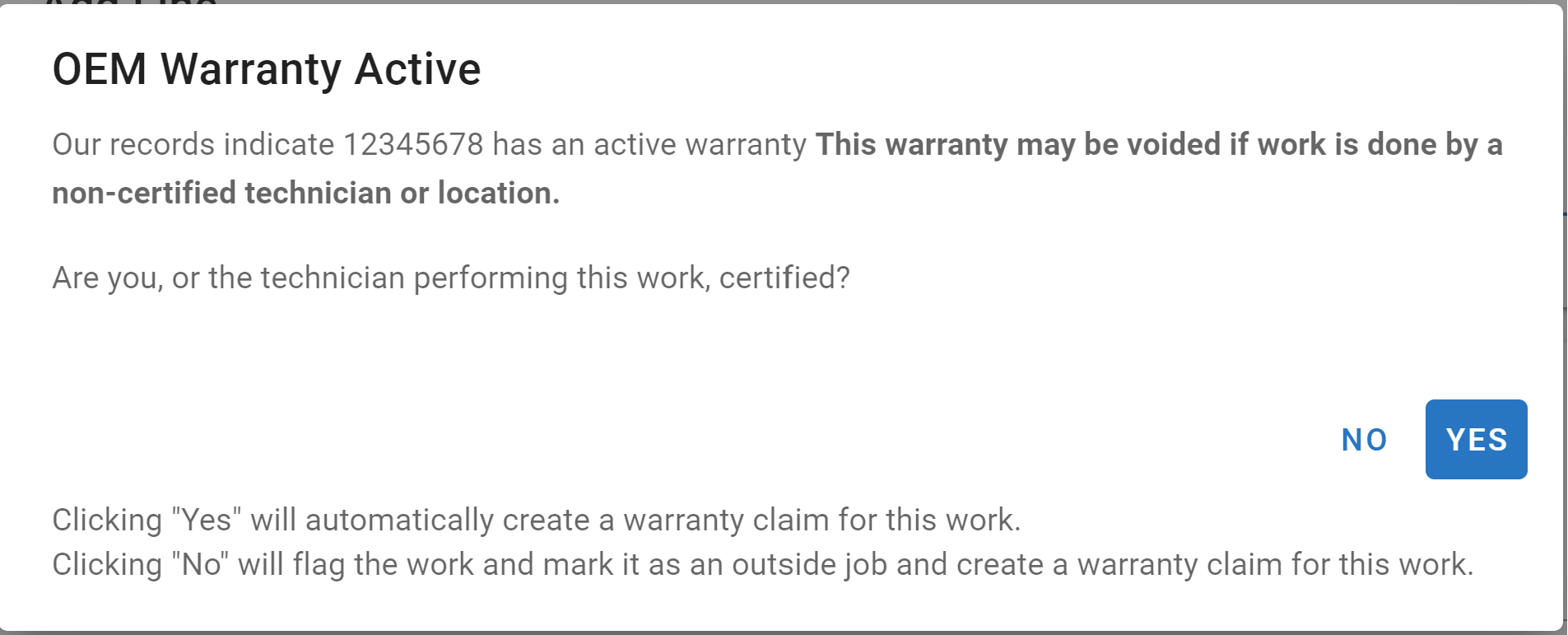 When OEM warranties are set up on an asset and a warrantied job is added to a work order there will be a pop up notification to assist in OEM warranty tracking.