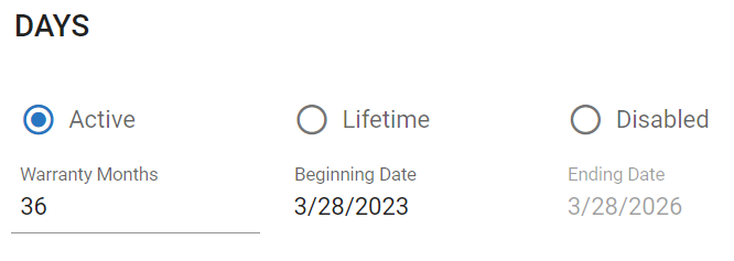 Under Days, add the following if extended warranty coverage has a date or day-based duration: