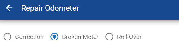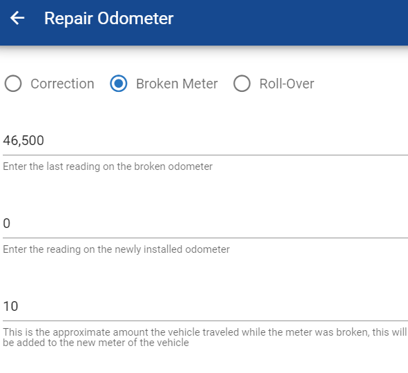 When performing the broken meter action, the primary odometer will be updated to the value set as the corrected meter reading, the life meter will be set to the sum of the broken meter reading and the unaccounted for meter units. The fuel meter is not touched.