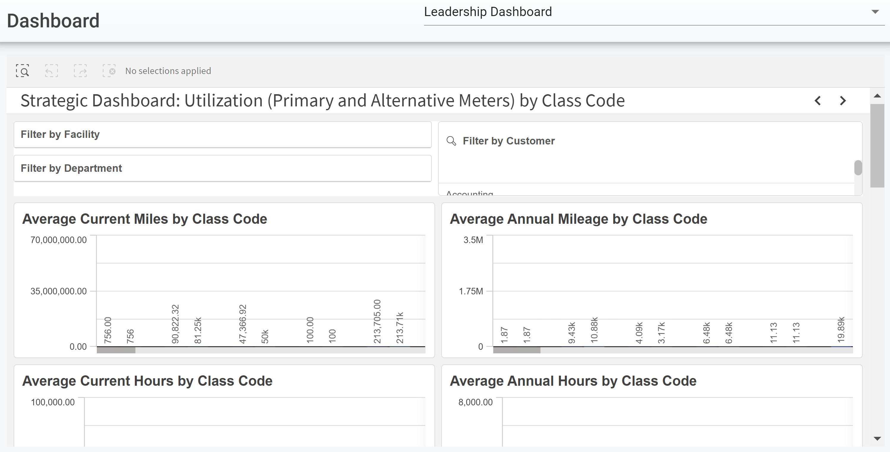 Average Annual Mileage by Class Code | When primary or alternate meter is set to “Miles”. | Calculated by dividing current odometer by age of asset. Then averaged by total assets assigned to the class code. |