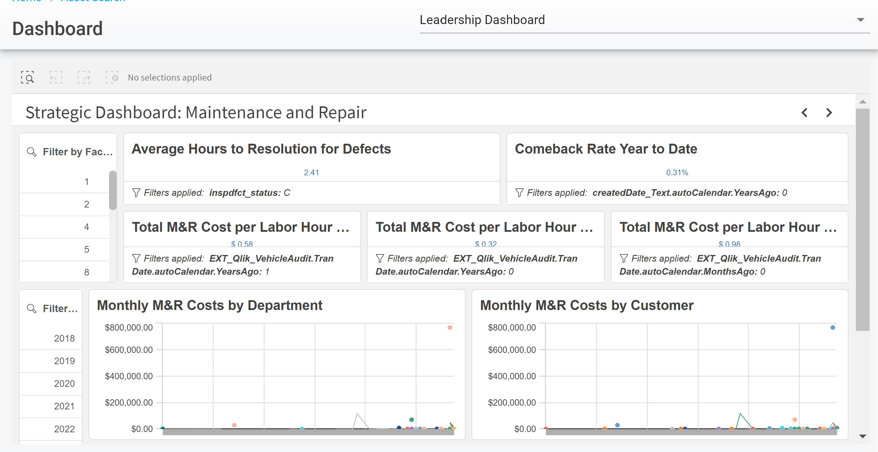 Average Annual Kilometers by Department | When primary or alternate meter is set to “Kilometers”. | Calculated by dividing current kilometers by age of asset. Then averaged by total assets assigned to the department. |