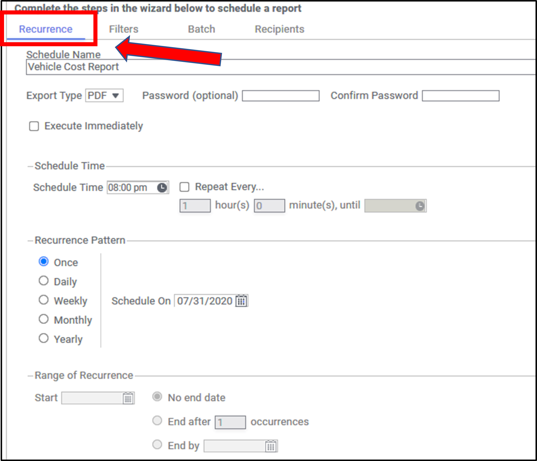 Range of Recurrence: Select a date to start. Check box for no end date, or check box to end after so many occurrences, or check box end by a certain date
