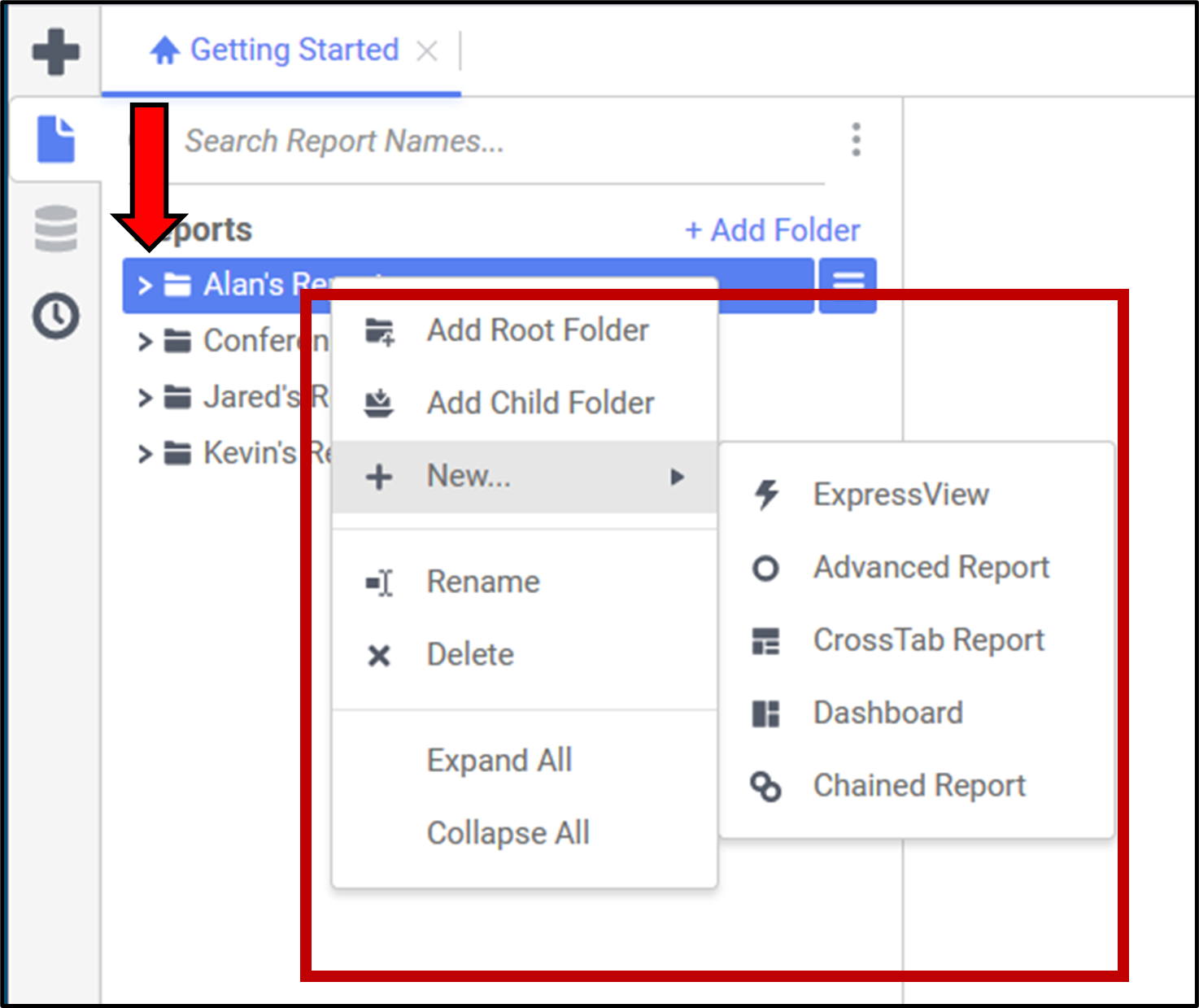 New...: Allows a user to add a new report to the folder and specify the report type.