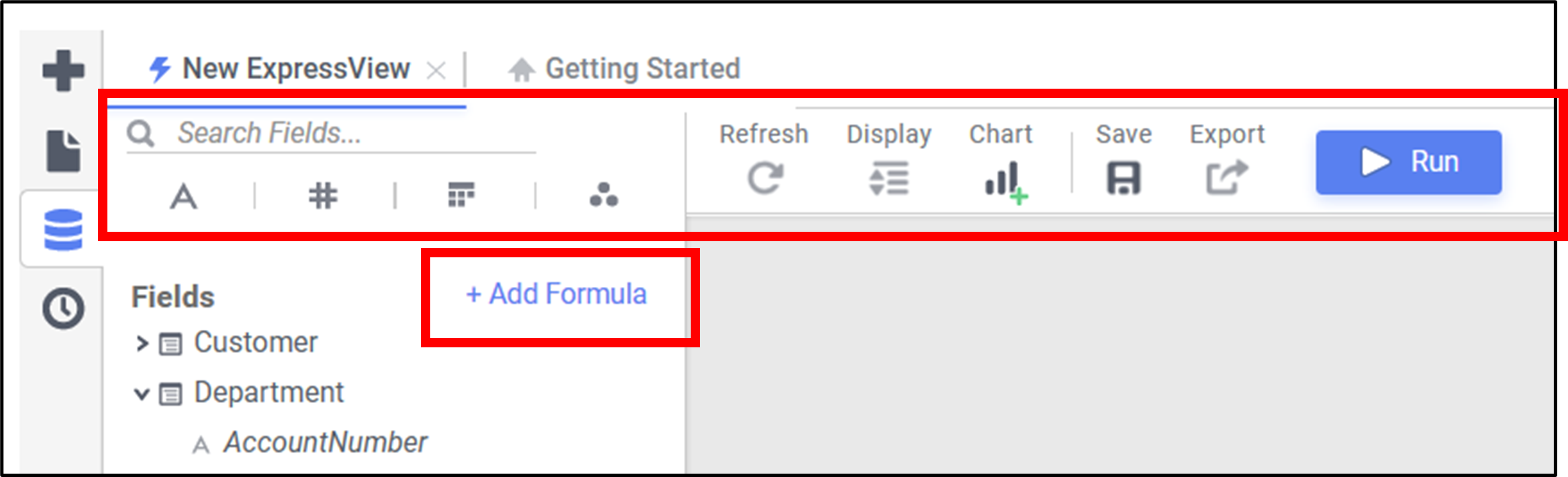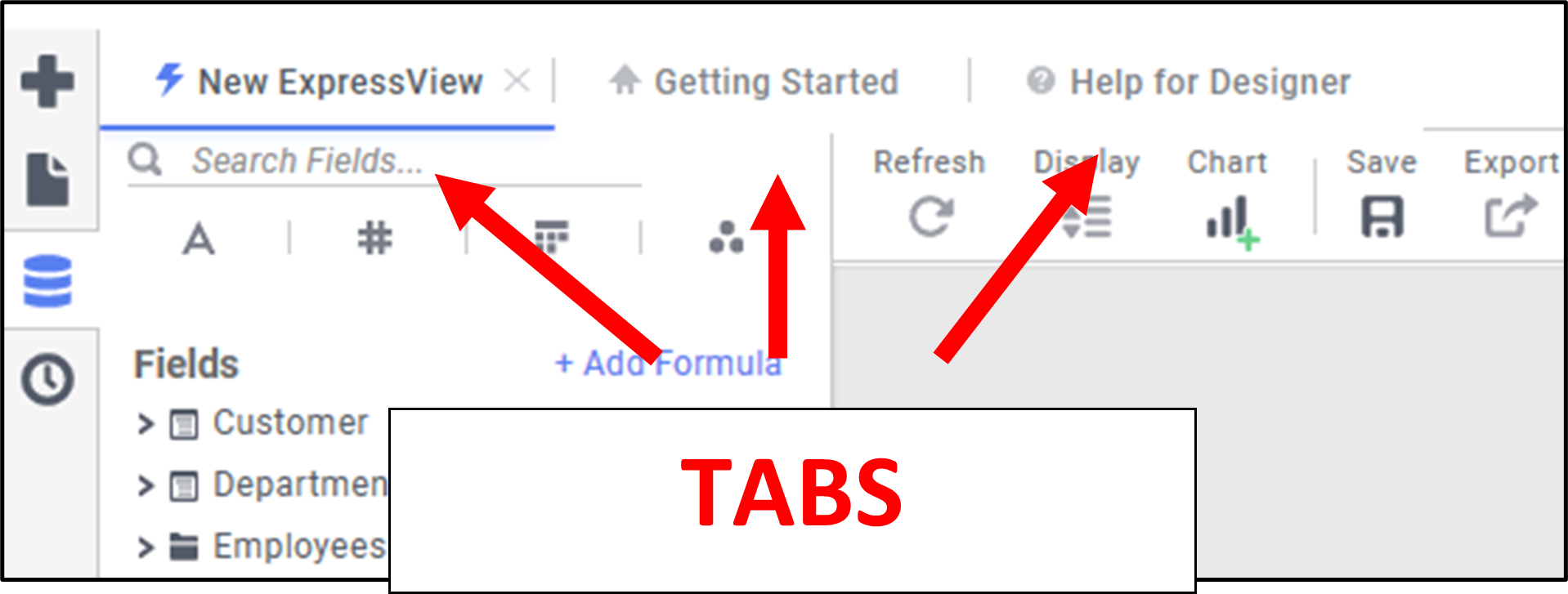 Tabs make up the application's main interface. This is where users build, design, and view reports as well as access help pages (). Tabs can be closed by clicking the (Question Mark) to the right of the tab name.