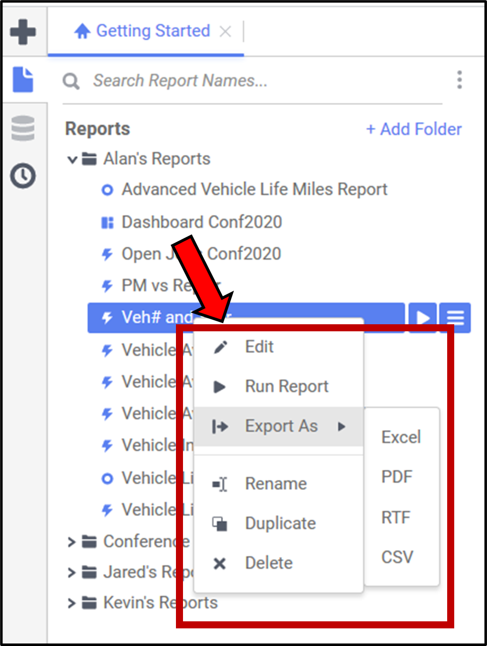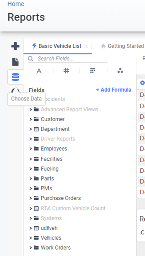 Folders are where the reports are saved. All reports must be saved in a folder. Folder names could be the person(s) creating the reports or could be for the type of reports (e.g. Vehicles, Parts, WO’s). If the desired folder is not there, click the “Add Folder” icon and enter the folder name.