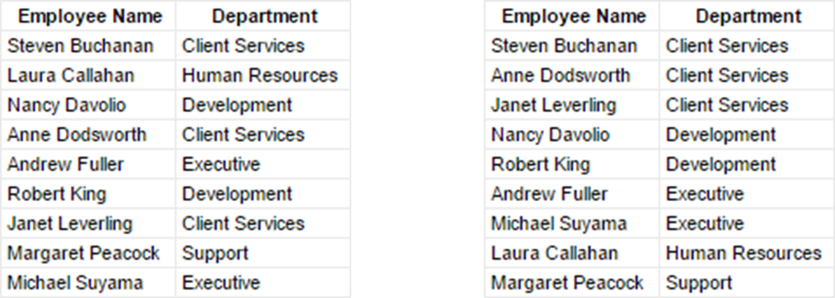 Sorting is the process of ordering your data rows by a certain sequence. For each available data category, you can choose which data field should be used to sort the rows. Fields can be sorted in ascending or descending direction. The way in which rows are sorted depends on the type of value in the field: