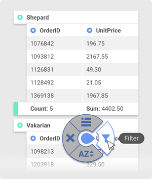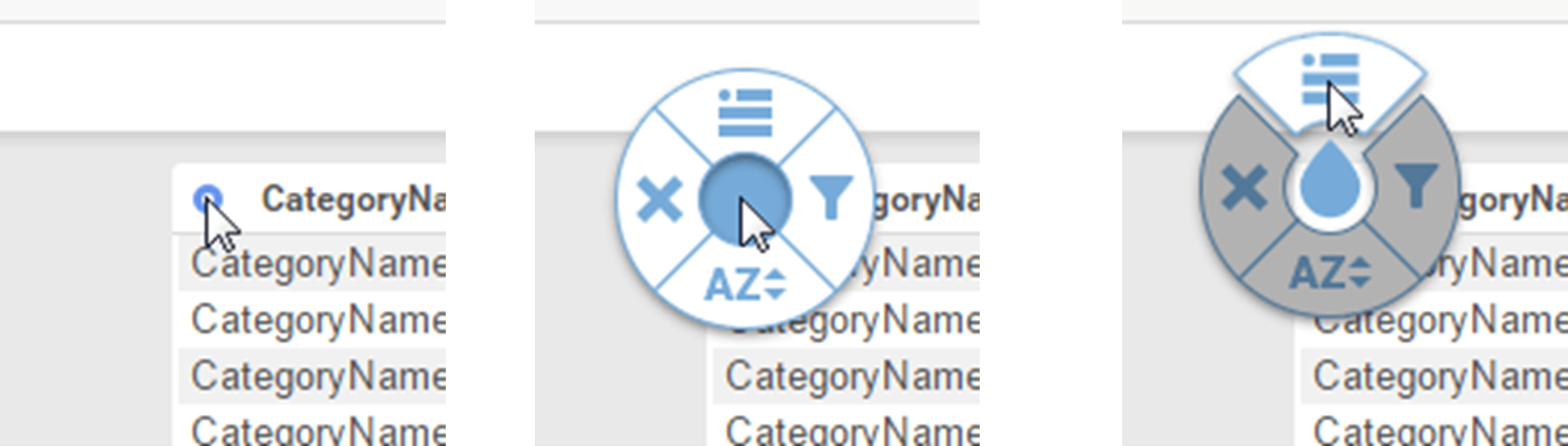 Throughout this topic you will see references to a menu called the radial menu. The radial menu is a menu of options for each data column and group, which is accessed by clicking the colored Radial icon on the top left of the column or group.