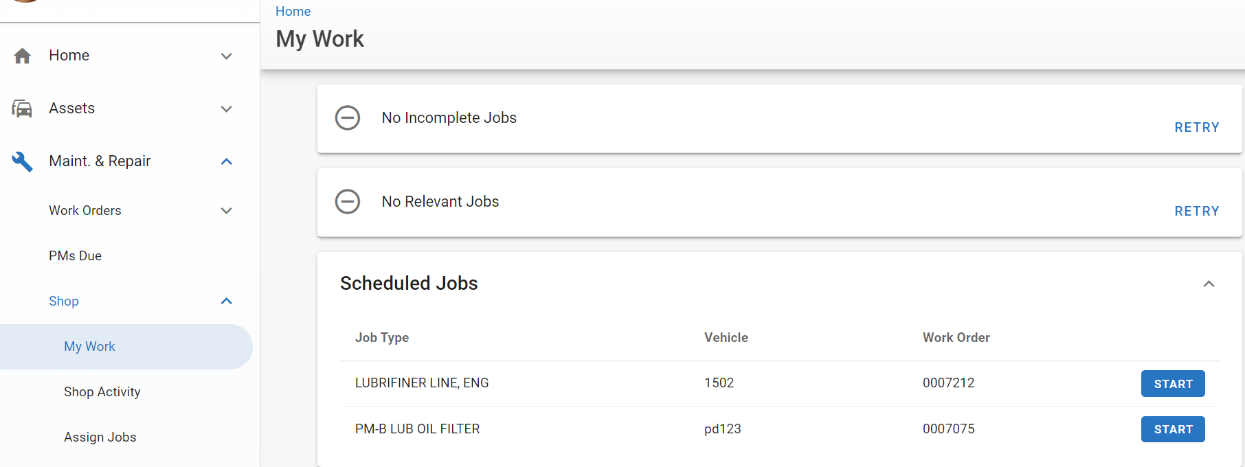 Or use the Shop > My Work options in the left-menu to view all currently assigned Incomplete, Recent and Scheduled Jobs