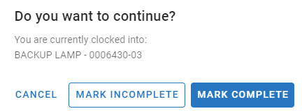 When all work and notes are updated or completed, the tech can clock off of this job as “Complete or Incomplete”. You will select either the next Direct/Indirect job from “My Work” or the top-menu dropdown options. When the next job is selected, you’ll be prompted to finish the one you’re on.