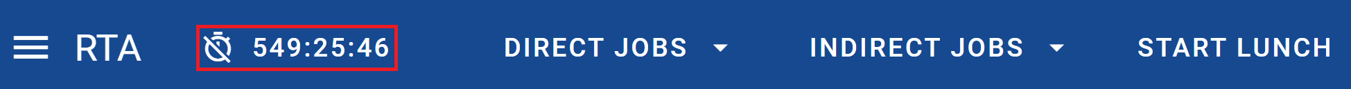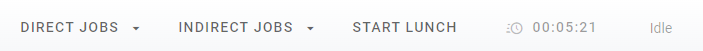 Whether the user is currently clocked into a Direct or an Indirect job, use the menu at the top of the screen to “Start Lunch”, or hover over the Stop-Watch icon (Job Clock) in the top-right corner and click End Job