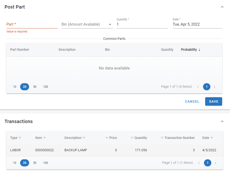 When you select “Post” from the Job Details screen, the transaction options will show. Use the “Part*” line to scan/enter a part number or description. When you begin typing, a list of options will appear. Select from the list. Enter the quantity and “Save” to post.