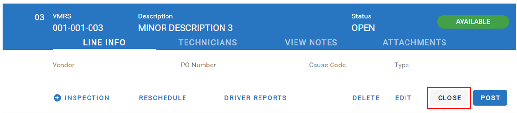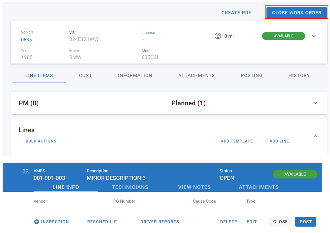 Once the WO line has been posted, the user can proceed forward and close it out. To do so, they will need to click on the WO line details, then click on close.