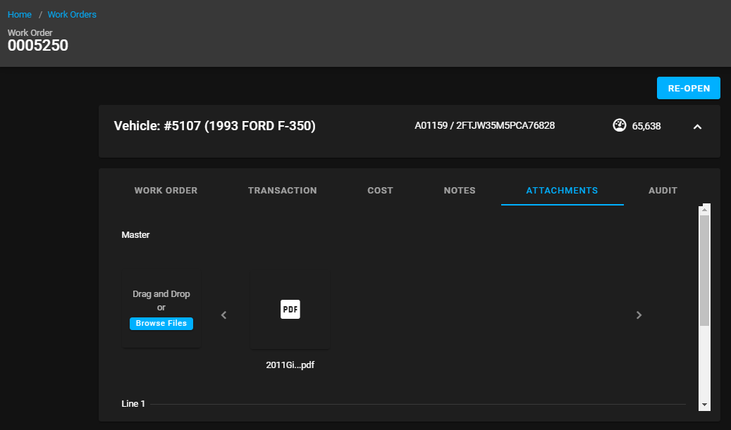 To reopen a work order line, the work order itself will need to be reopened. If you try to reopen just the work order line, the entire work order will reopen. To reopen the work order line, navigate to the line and click it. The line details will then appear and the reopen button will be visible.