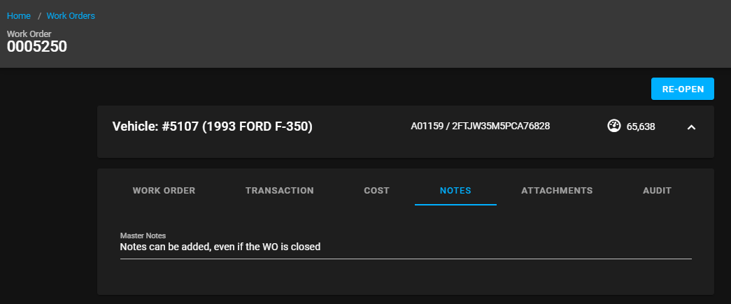 If the user logged in has permissions to do so (User Group Rights, Work Order Management > Edit closed WO lines), they will be allowed to add notes and attachments without needing to re-open the Work Order or the Line.