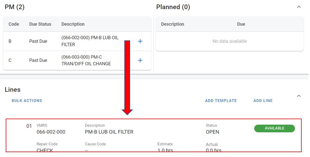 A Work Order will show if the asset in question has PMs or Planned work due. If the user chooses, they can simply double-click the PM or Planned line in order to add it to the Work Order as a new Line.