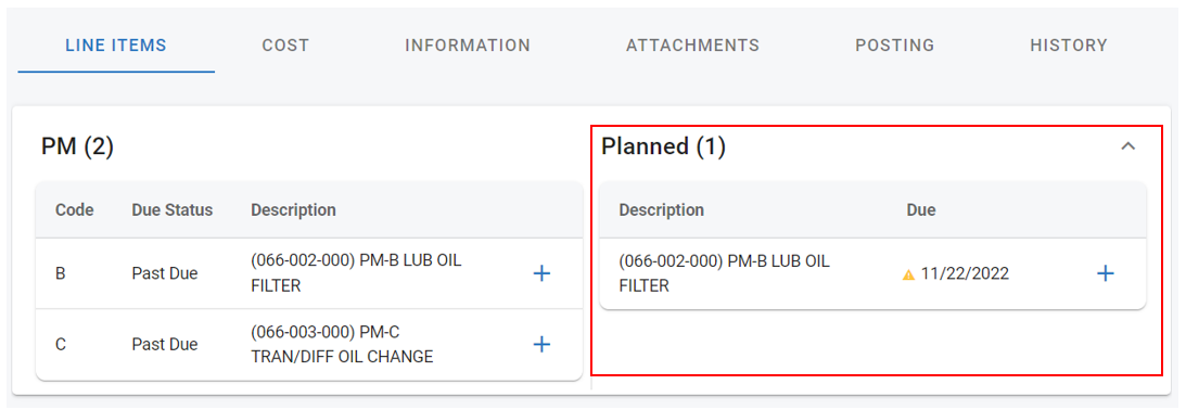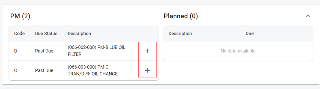 Following the ‘Planned Jobs’ rules, a work order line can be rescheduled either by a particular Date, PM or Odometer trigger, thus removing it from the work order it’s on and placing that line in a ‘Planned’ status. Similar to PM lines, these Planned-Work jobs can be applied to an open work order by clicking the + button on the Work Order screen and updating job details.