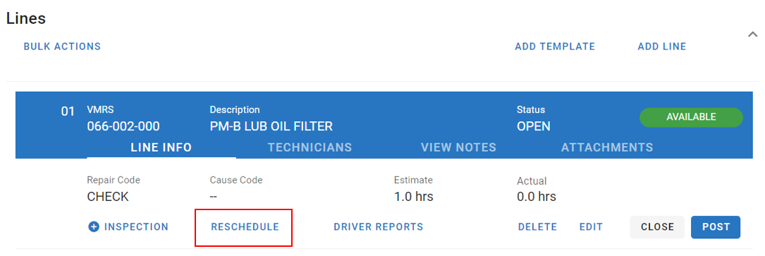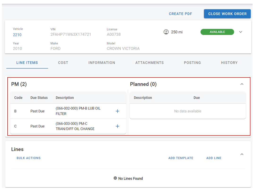 When a PM is due on the asset, that Code, Status and Description will show when creating an asset’s work order. If a job is being performed and a PM line needs to be added, from the Work Order page click on the + button and a new line will be added. Job details (assign technician, add notes, etc.) can then be added to the newly created line.
