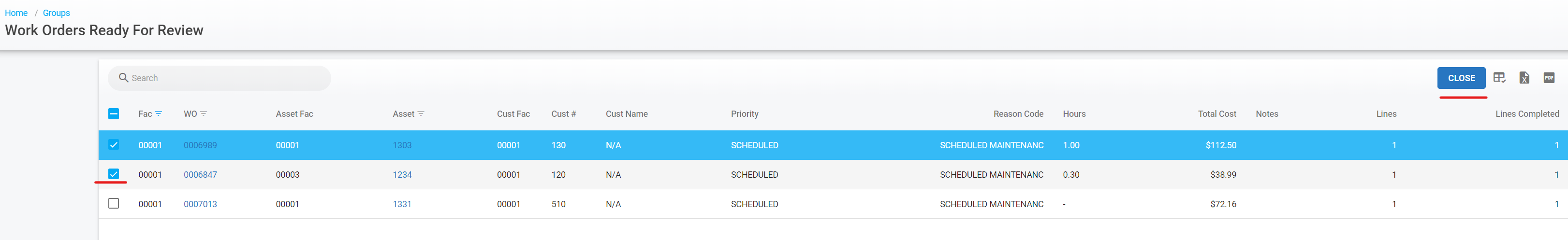 Reviewed work orders can be closed individually or in bulk after the review process is completed.