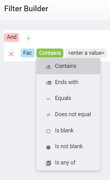 Click the condition setting (Contains) to change the filter condition. Use either Contains, Ends With, Equals, Does Not Equal, Is Blank, Is Not Blank, or Is any of