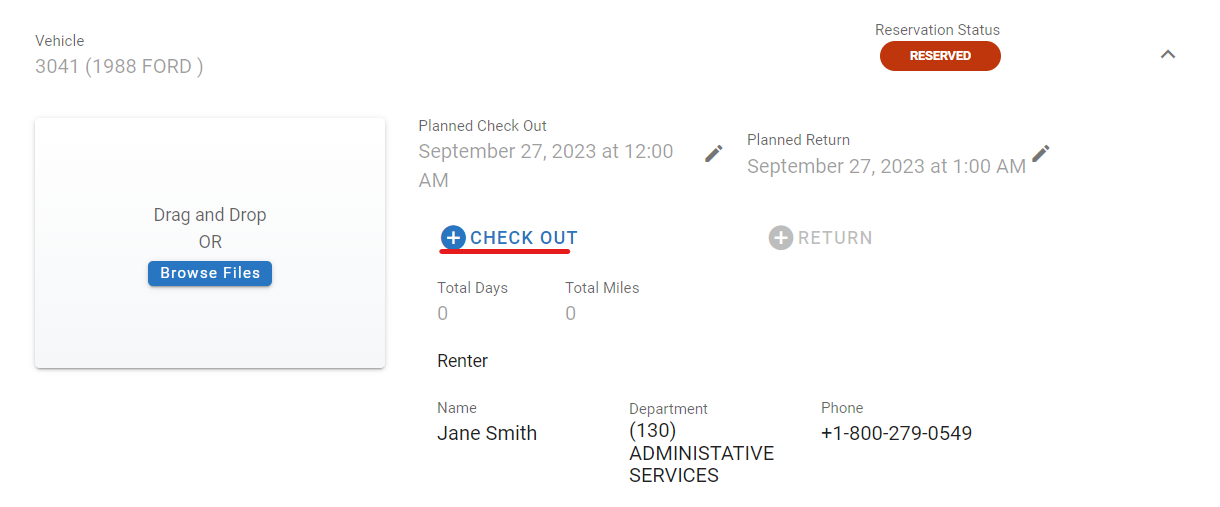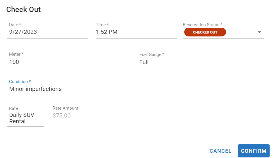 When the renter or driver comes to pick up the asset, be sure to perform the check-out action within the reservation.