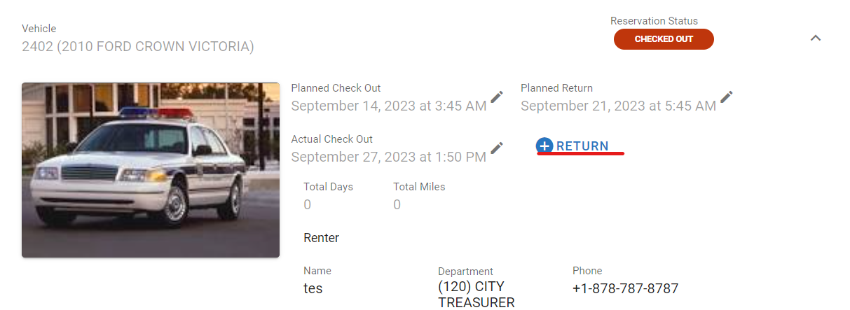 When the renter or driver returns the asset, be sure to perform the return action within the reservation to capture costs and close it out.