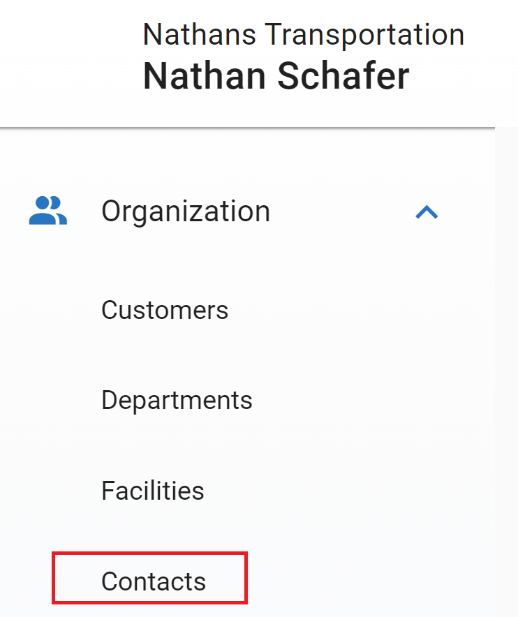 Navigate to the Contacts tab under Organization in the left-hand menu path and click “Contacts”