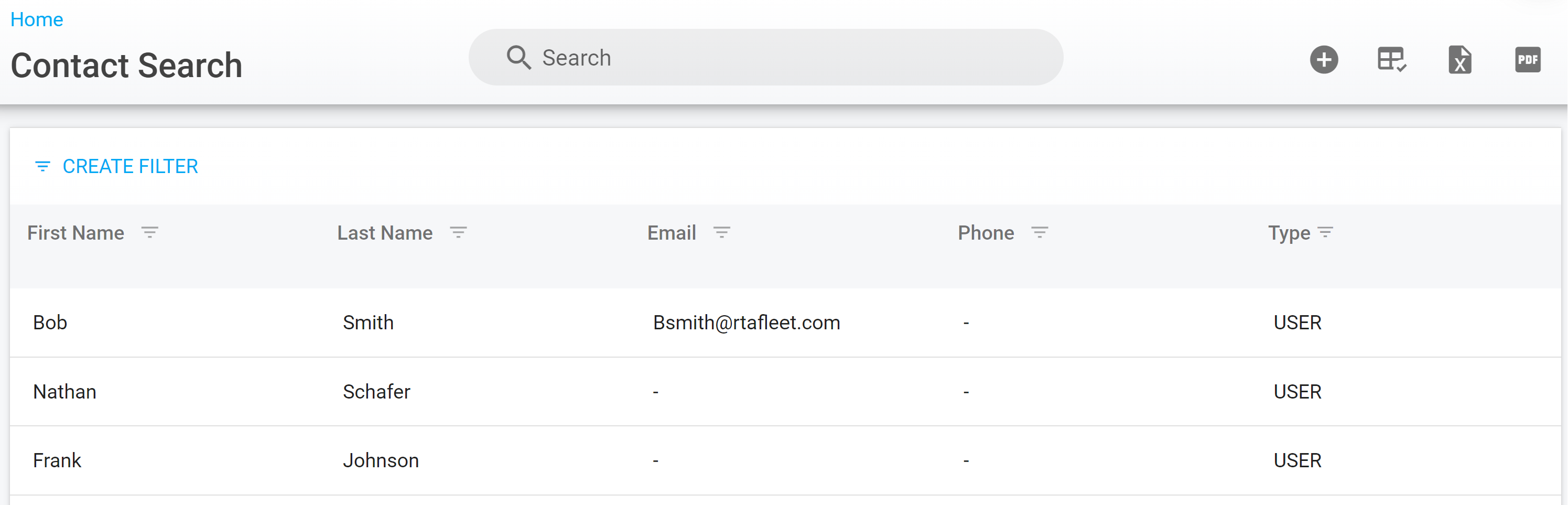 You will see the contact search screen open and a list of contacts in the system. These come from user creation or entering primary contact info in customer files. See Contacts here to add contacts to the system