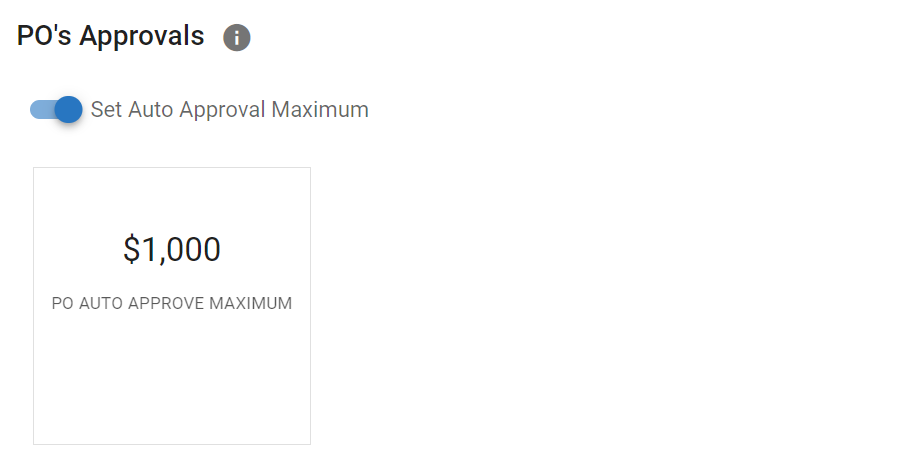 Use this panel to set an auto approval maximum for Purchase Orders attributed to this facility. This will auto-approve any purchase order at or below that maximum. Amounts above that maximum can go through the settings of the approval process set in place.