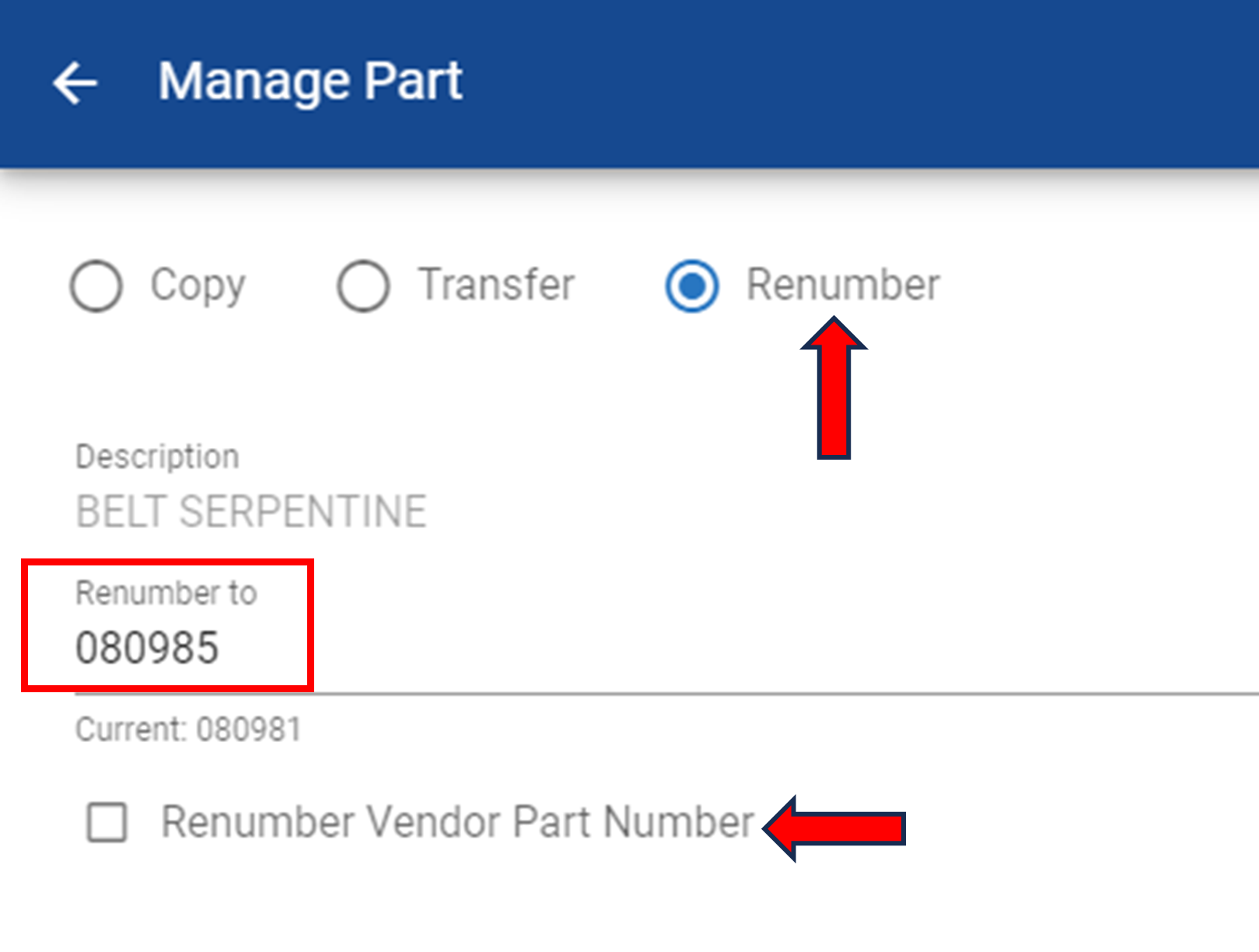 If the Vendor Part Number also needs to be renumbered to match the entry, check the box to do so