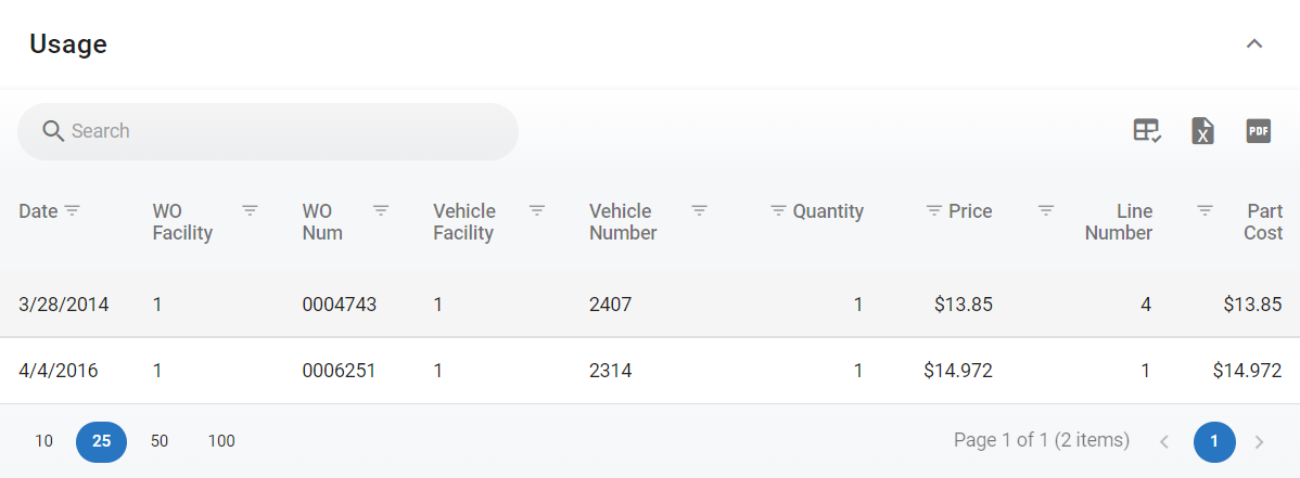 The usage panel will display when and where the part was used and feeds directly from Work Order data entered in RTA.