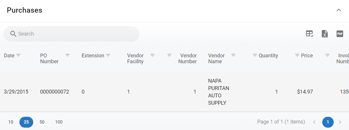 The purchases panel displays data pertaining to the part purchases made and feeds from purchase orders in RTA Desktop.