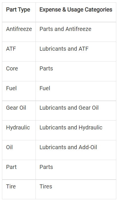 🔓 Part Type – The RTA System separates vehicle costs and usage into eight categories (shown below). More may be added. Contact our support@rtafleet.com for more information on how to allow this feature.