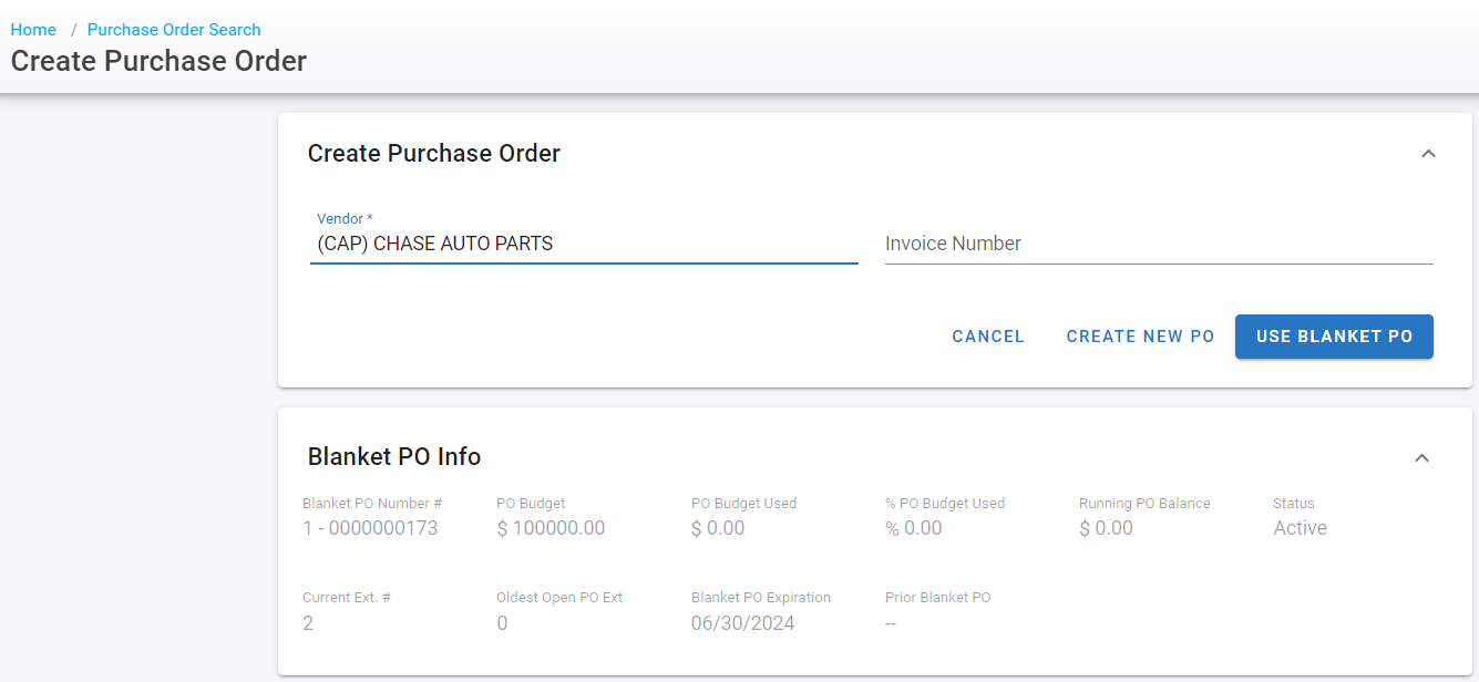 If no blanket PO exists, “Create New PO” will be the primary button option displayed