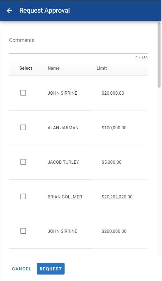 Only users that can approve the amount you are requesting are available