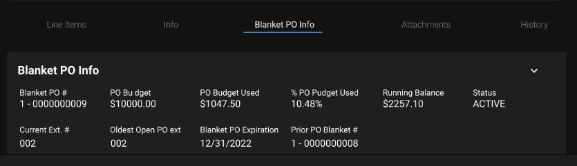 The Blanket PO Info Tab is a read-only panel displaying specific blanket items. If there is no blanket PO for the specific PO accessed, it will display as “No Data.”