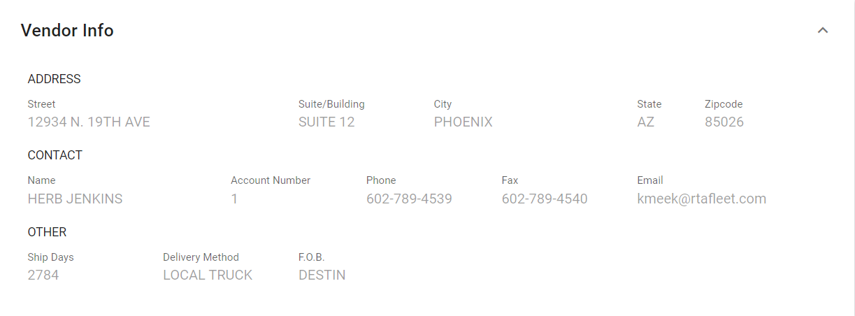 The Vendor Info panel pulls information directly from the vendor file in RTA and is informational only.