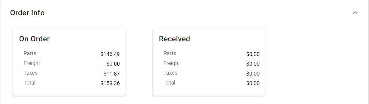 The Received section will display the itemized and total cost associated with the items received from the order. This includes: