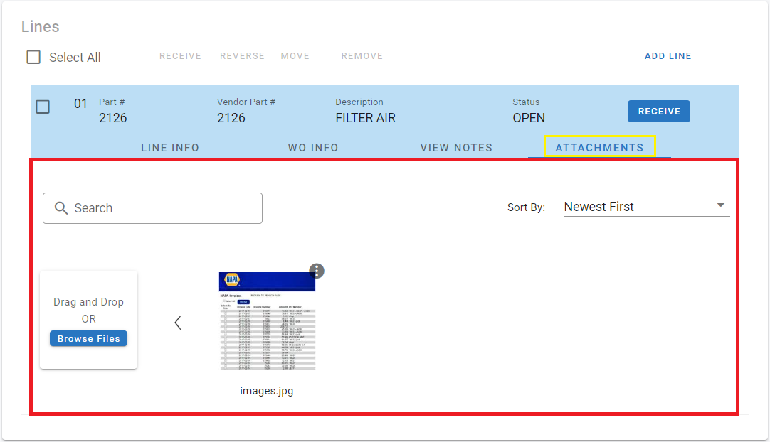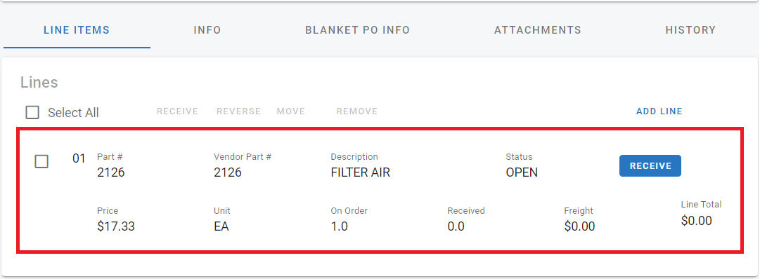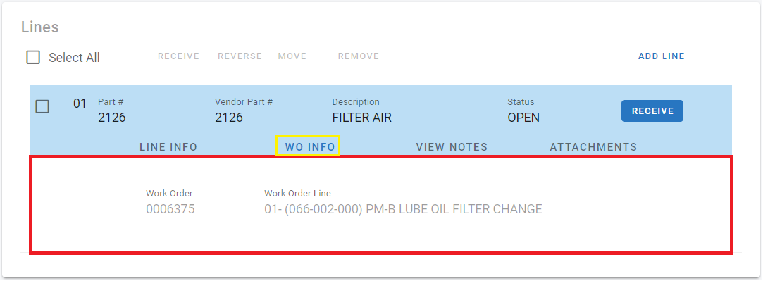 🔓 Select All - Check Box can be used to select all lines (or you can select individually). This allows you to perform Bulk Actions including receive, reverse, move, or remove action for multiple lines at the same time within the purchase order