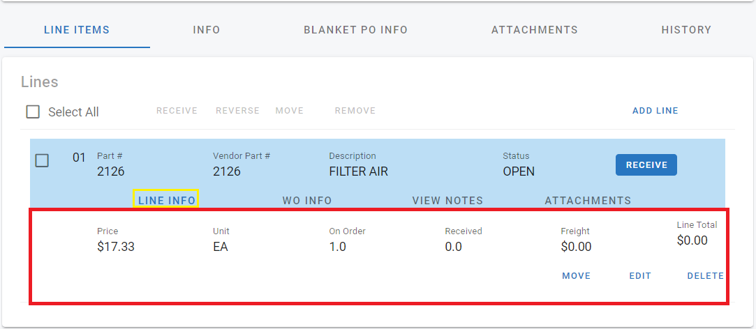 The various lines added to a PO will be visible in the Line Items Tab. Each line has its own relevant information and each line will contain four additional sub tabs for information pertaining to that specific line.