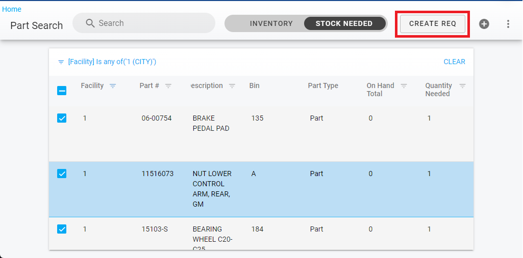 The Stock Needed Master List also saves time by allowing users to click the Inventory button to switch the view from the auto requested parts for order to view the entire parts inventory.