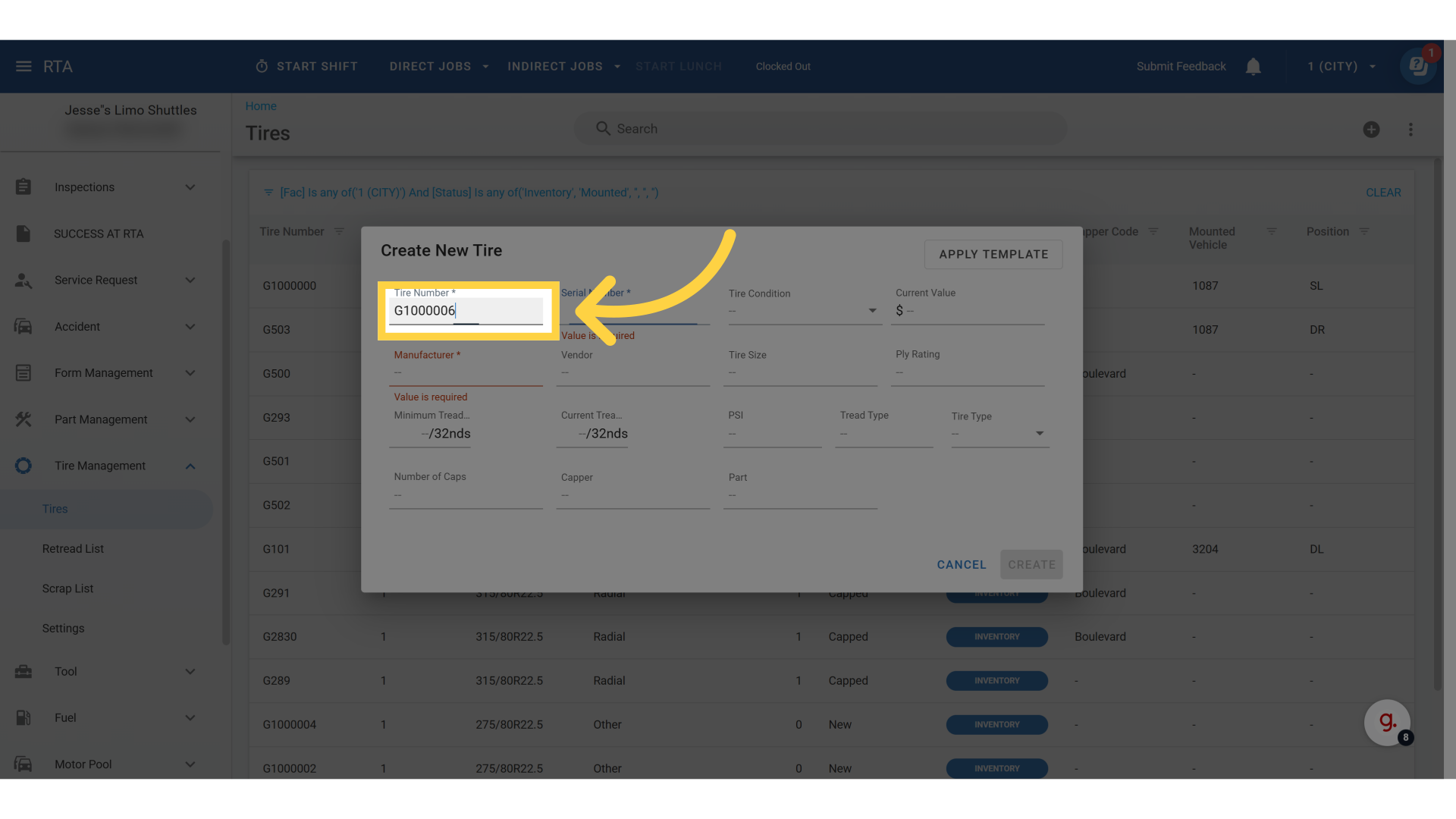 1. Click on Tire Management → Tires → Plus icon top right corner