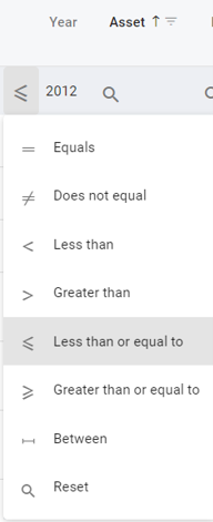 For example, selecting the Asset Year Greater than or equal to and typing in 2012 will give me a list of my assets that are 2012 and newer. You can also use multiple column filters to get detailed lists.