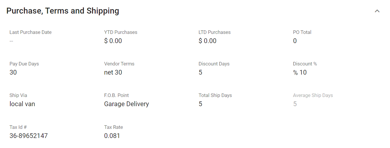 Enter Pay Due Days, Vendor Terms, Discount Days, Discount %, Ship Via, F.O.B. Point, Total Ship Days, Tax ID#, and Tax Rate as applicable
