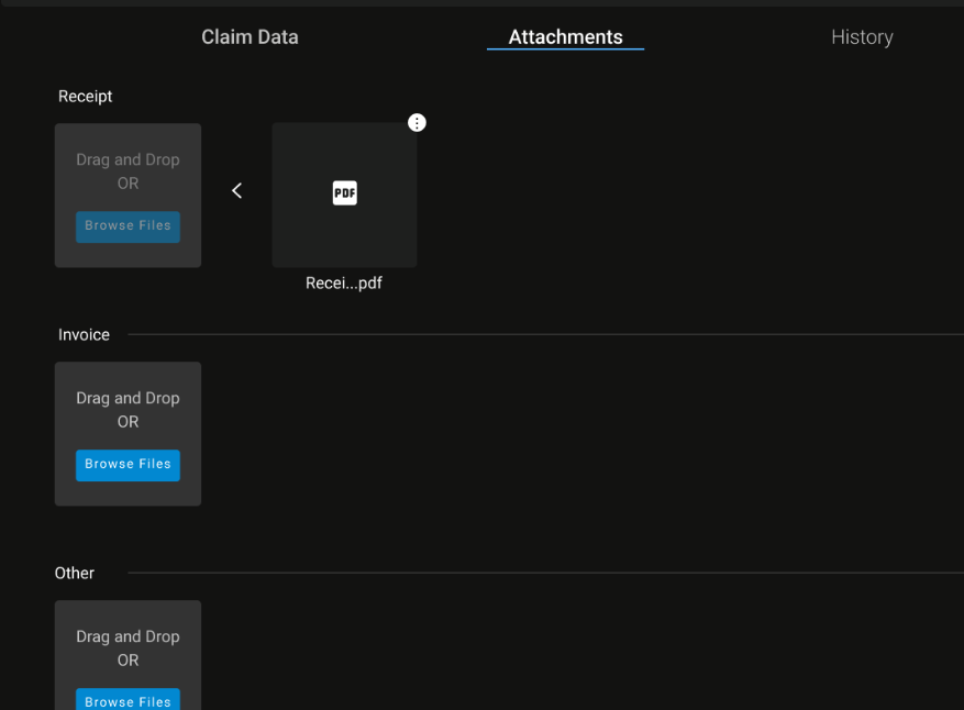 The attachments for claims are separated to keep attachments organized. There is a section specifically for receipts, invoices, and another labeled as “other” for all other attachments.