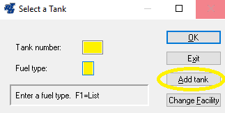 - In the “Tank Number” field, key in a numeric designation for the tank you wish to add. In the “Fuel Type” field key in the single upper-case alpha character for the fuel stored in this tank, or press “F1” for the lookup list. Select the “Add Tank” button.